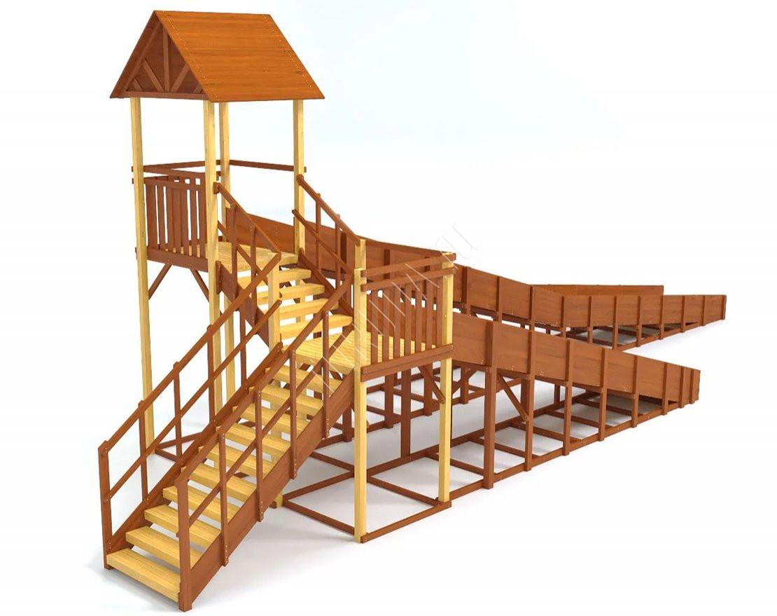 При изготовлении конструкций уделяется особое внимание безопасности всех элементов: углы скруглены и поверхности тщательно отшлифованы. Лесенки, перила и страховочные ограждения продуманы с точки зрения безопасности и удобства для детей.