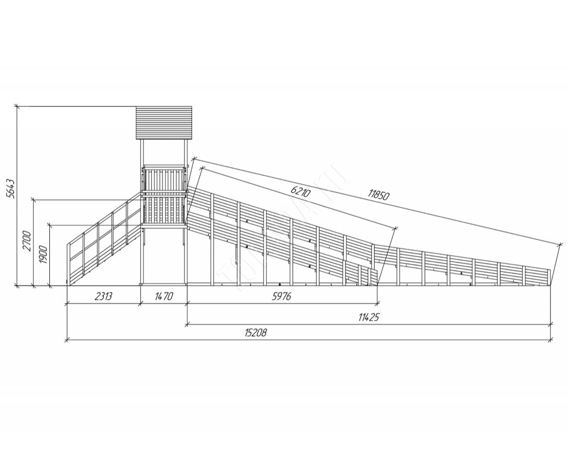 Конструкция тщательно спроектирована и выполнена из качественных материалов, что гарантирует безопасность и долгий срок службы. Каркас изготовлен из надежного клееного бруса, а в качестве защитного покрытия использован лакокрасочный состав с разрешающим сертификатом для применения на детских площадках.