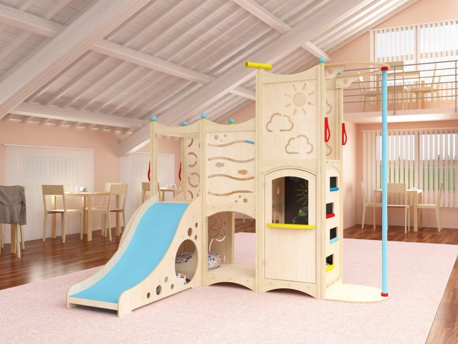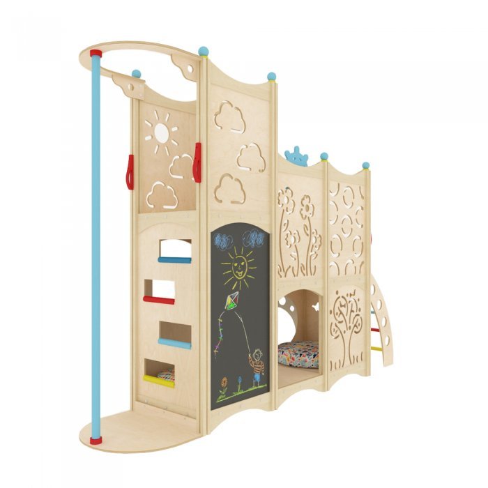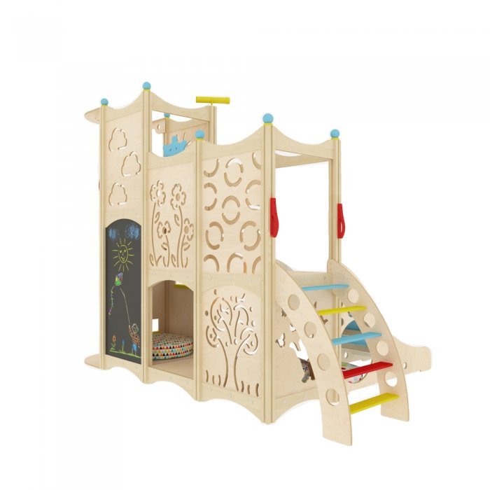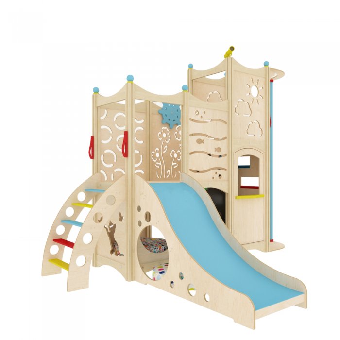Сооружение смело можно назвать домиком, потому что оно наделено окошками, дверкой. В качестве спортивно-развлекательных модулей имеются лесенка с разноцветными ступеньками, волновая горка, шест, многочисленные фигурные выемки для лазания и декора.