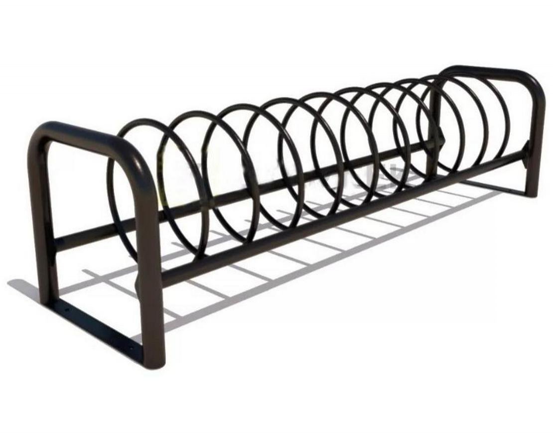 Велопарковка изготовлена из стали, имеет стандартную конструкцию с ячейками и рассчитана на большое количество велосипедов. Каркасная часть выполнена из профильной трубы увеличенного диаметра, в качестве перегородок секций использованы трубы меньшего размера. Боковые основания имеют вид прямоугольников, сплошные стенки отсутствуют, и громоздкий объект не выглядит массивным. Для окрашивания используется специальная краска – яркий оттенок не выцветает и редко требует обновления. Невысокий объект занимает мало места, функционален и выполнен в духе минимализма.
